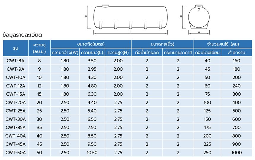 • ปริมาตรความจุ 8–50 ลบ.ม.