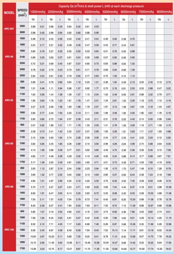 • มีให้เลือกปริมาณลมตั้งแต่ 0.42-184.4 ลบ.ม./นาที กำลังไฟ 0.4-117 กิโลวัตต์